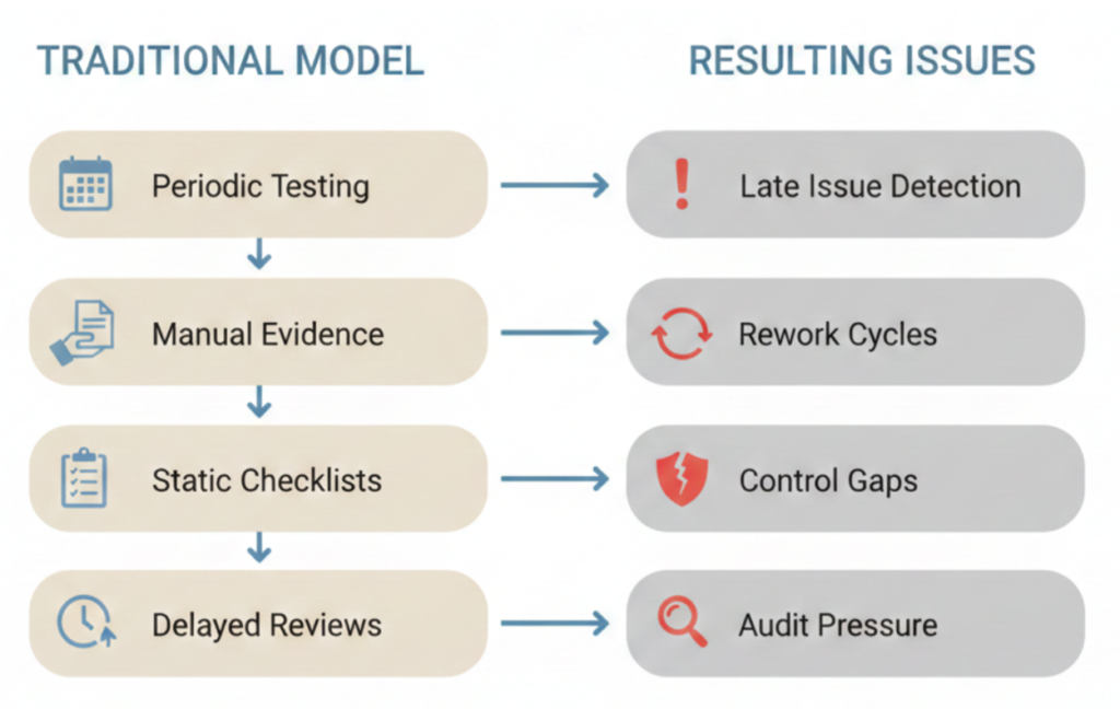 Conventional compliance approaches rely on static checklists, periodic testing, and documentation assembled after activity has taken place. These methods assume stability in processes and predictable risk patterns. In practice, business operations evolve faster than compliance frameworks can be updated.