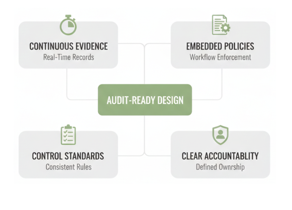 Audit-ready design is built on the following foundational elements that ensure compliance is sustained rather than assembled later:
