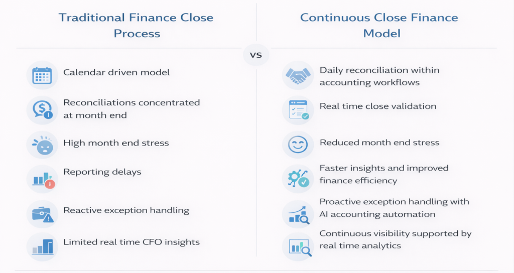 Continuous close finance restructures the closing model by embedding reconciliation, validation, and review into daily accounting workflows instead of concentrating them at period end.